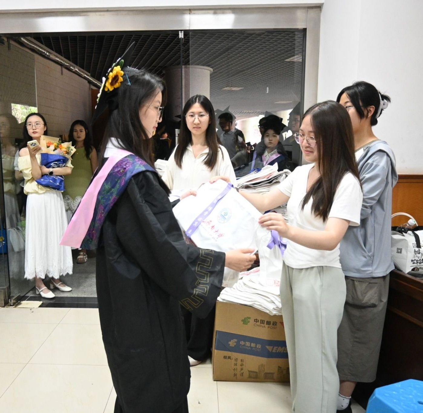 一届有一届的传承,一年又一年的创新,学院为毕业生精心设计定制了独特的毕业礼物——帆布包。帆布包的设计融入了丰富的校史文化元素,印有学校的校徽和学院的院徽、“弘毅博学,求真至善”的校训和“文心养正,弘毅致远”的院训、学校升华广场等标志性建筑物的图案,彰显出浓厚的校园文化气息。毕业礼物承载着学院对毕业生的美好祝愿和深切期望,希望毕业生能秉承学识与品德,不忘初心,勇敢前行。