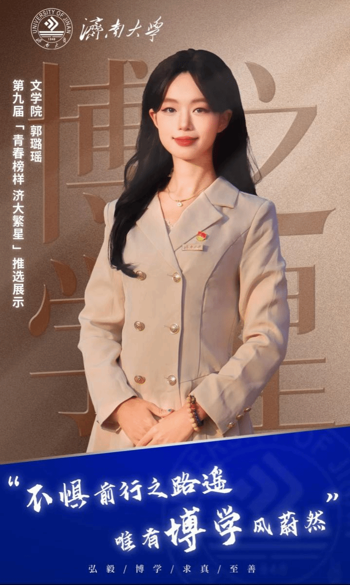 博学勤思,履践致远。郭璐瑶将深耕厚植的“定力”注入每一堂课,在取得优异成绩的同时,主动跳出舒适区,赴北京大学研修了《媒体与国际关系》等课程并获A类优异成绩,为自身知识版图扩容。此外,郭璐瑶携专业所学征战赛场,在国际广告公司及政府融媒体实习期间,运营奔驰官方小红书账号,完成麦当劳全国联名策划爆款等内容,在短视频制作、新闻采编中锤炼实战本领。作为清华乡村振兴工作站、南风窗调研中国百强团队核心成员,郭璐瑶深入田野探究抖音治村模式;作为全国三下乡示范性团队队长,她助力肥城农村品牌宣传,事迹被“学习强国”“济南市电视台”等知名媒体报道。300余小时志愿时光让她深知:博学之星的光芒不应该只照亮自己,更应温暖社会。