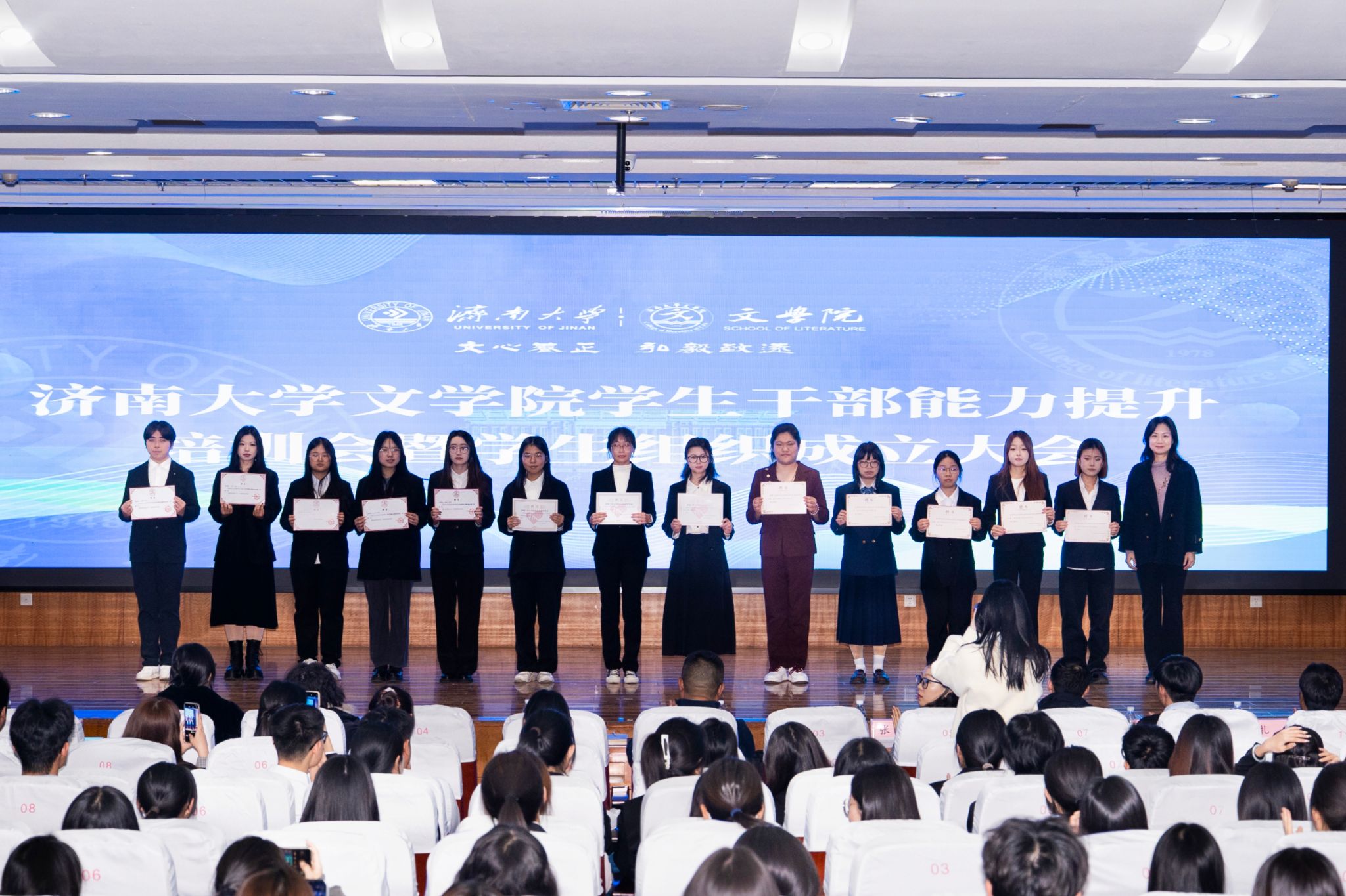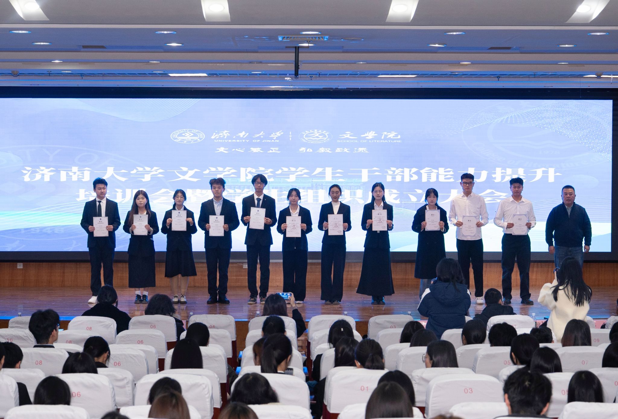 随后,朱海龙为学院第六届研究生会、第十一届学生会、第五届自律会主席团成员颁发聘书,潘颖为学院第三届融媒体中心、第二十七届初心志愿者协会、第五届心理协会主席团成员颁发聘书。