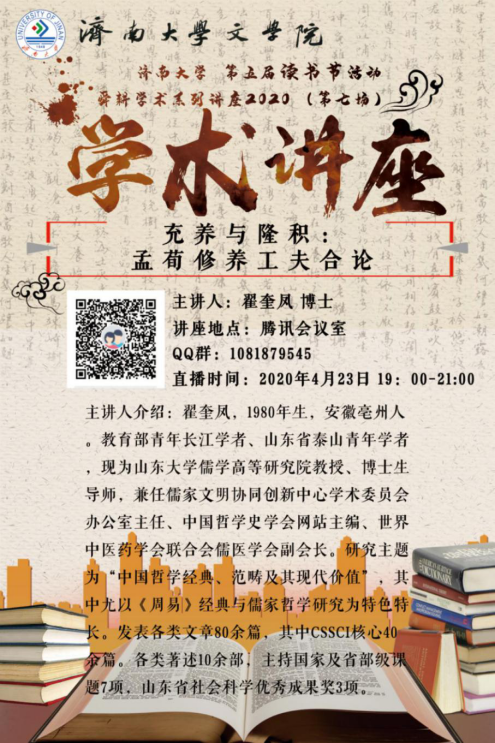 4月23日晚,ok138cn太阳集团第五届读书节系列活动、ok138cn太阳集团529“舜耕学术系列讲座2020”第七场如期举行。长江学者、泰山学者、山东大学儒学高等研究院翟奎风教授作了题为《充养与隆积:孟荀修养工夫合论》的学术报告。讲座采用腾讯直播的形式,ok138cn太阳集团529、政法学院、教心学院、国交学院等一百四十多位师生参加了互动交流。