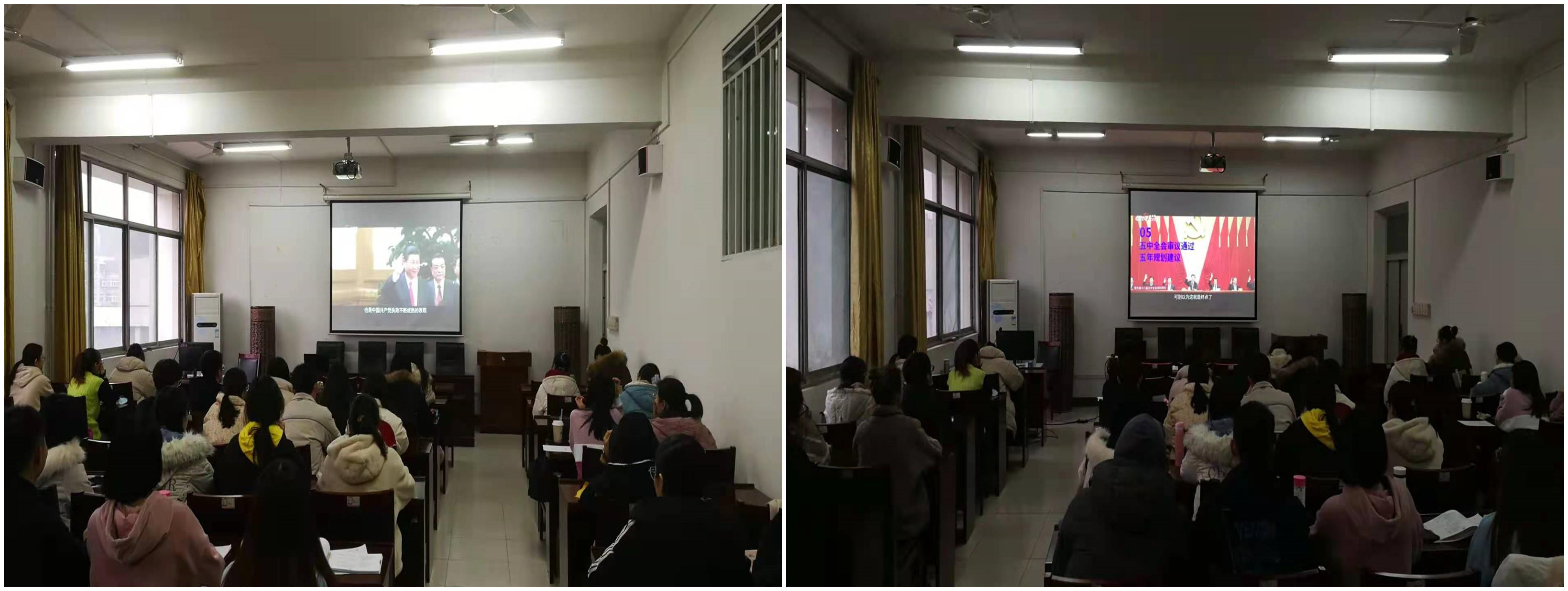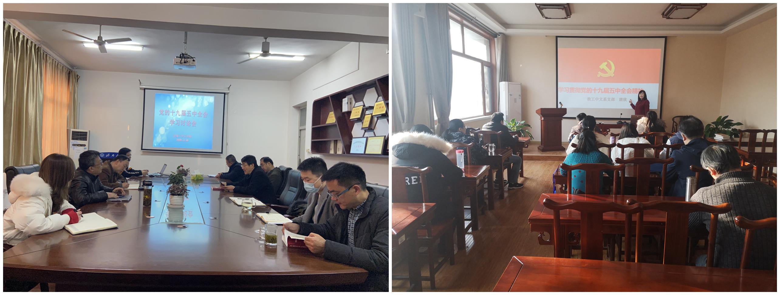 教工中文党支部支部书记唐欣从“一个核心地位、三个‘首次’、一个重大判断”三个方面,对党的十九届五中全会精神进行了详细解读。教工传播党支部共同学习了《党的十九届五中全会<建议>学习辅导百问》。学生中文党支部、学生传播党支部、研究生党支部学习了《中国共产党第十九届中央委员会第五次全体会议公报》、《党的十九届五中全会<建议>学习辅导百问》,结合学生实际情况对全会的十个新提法和十个新理念新思想新战略进行了系统的学习和领会。