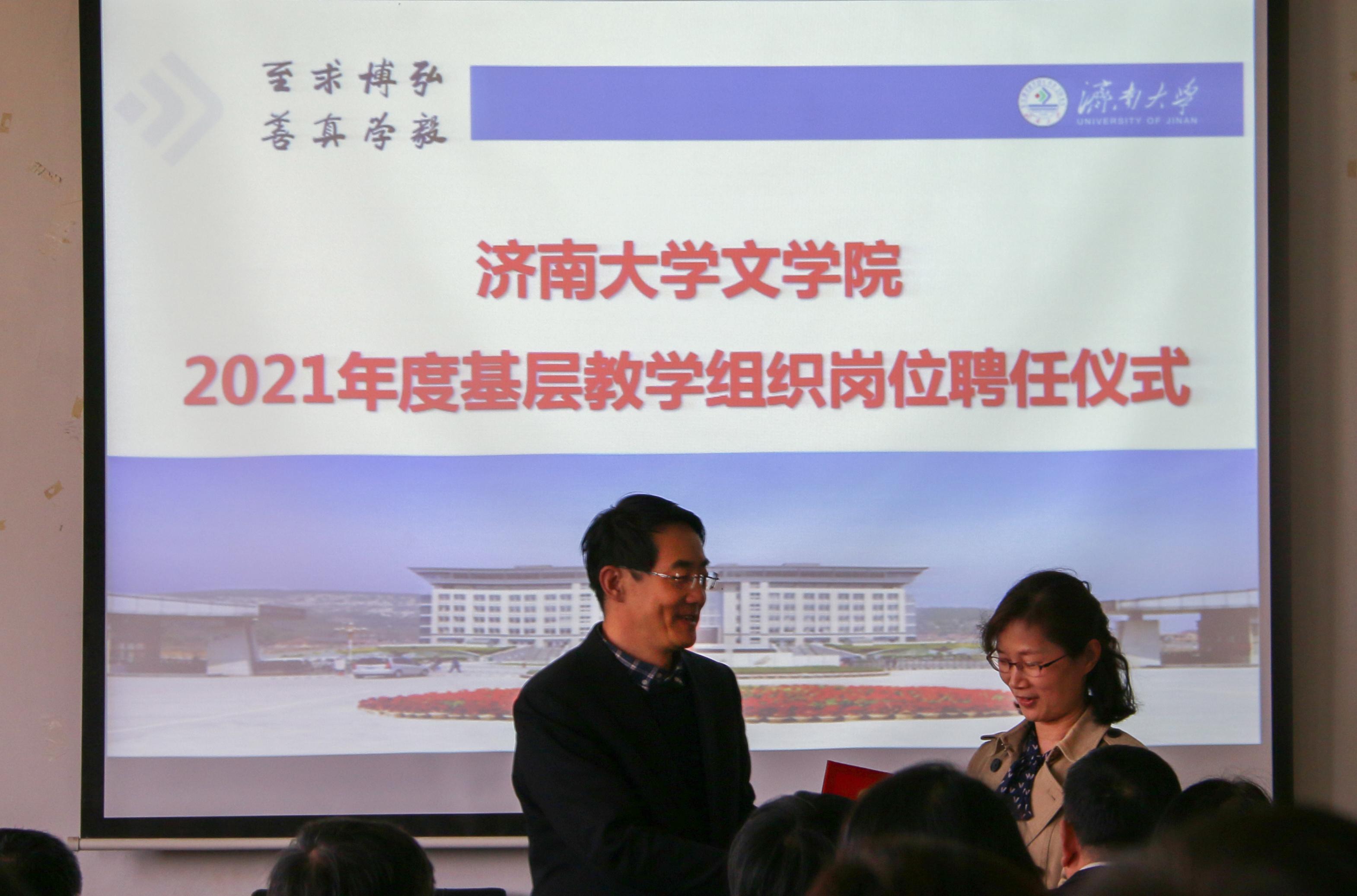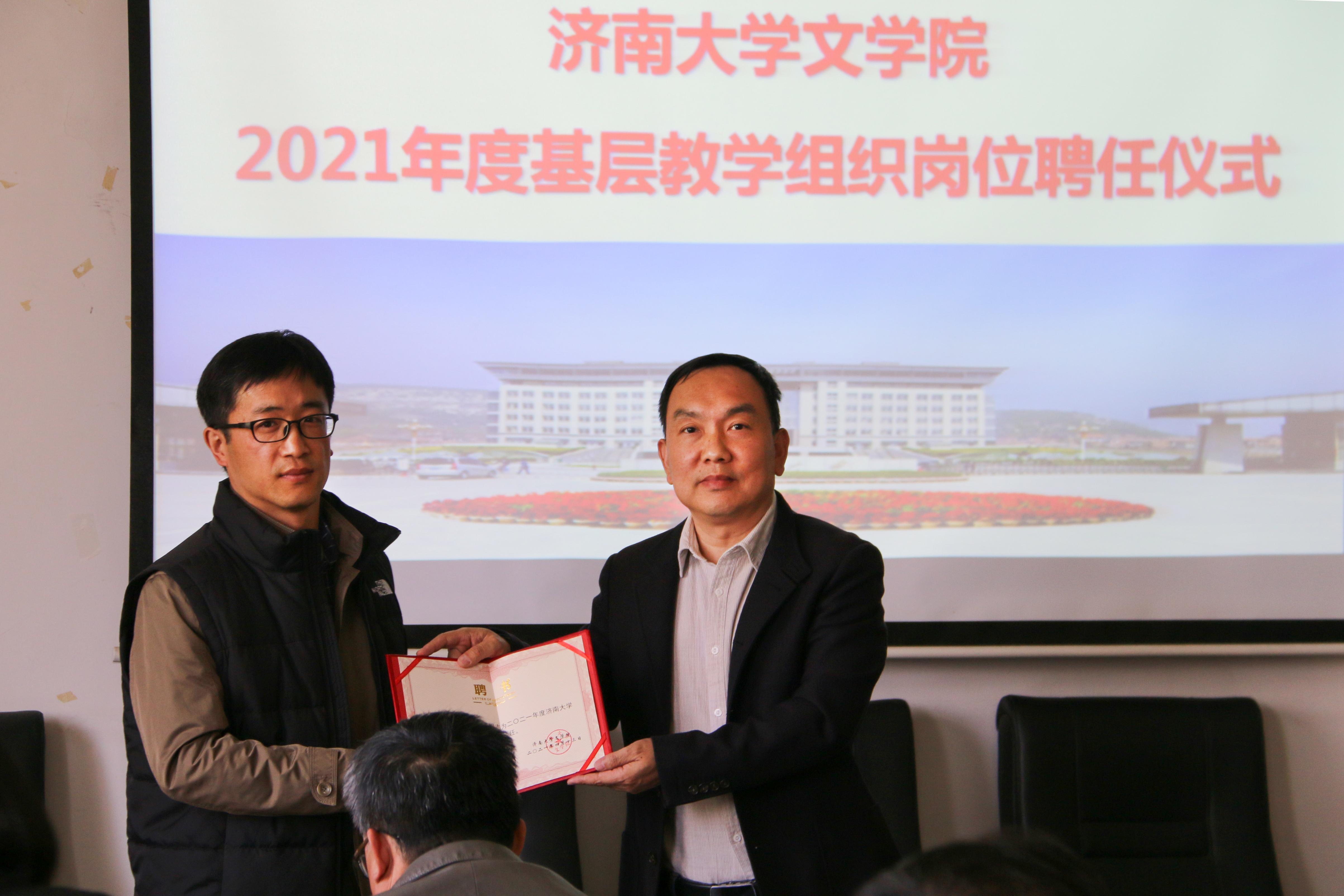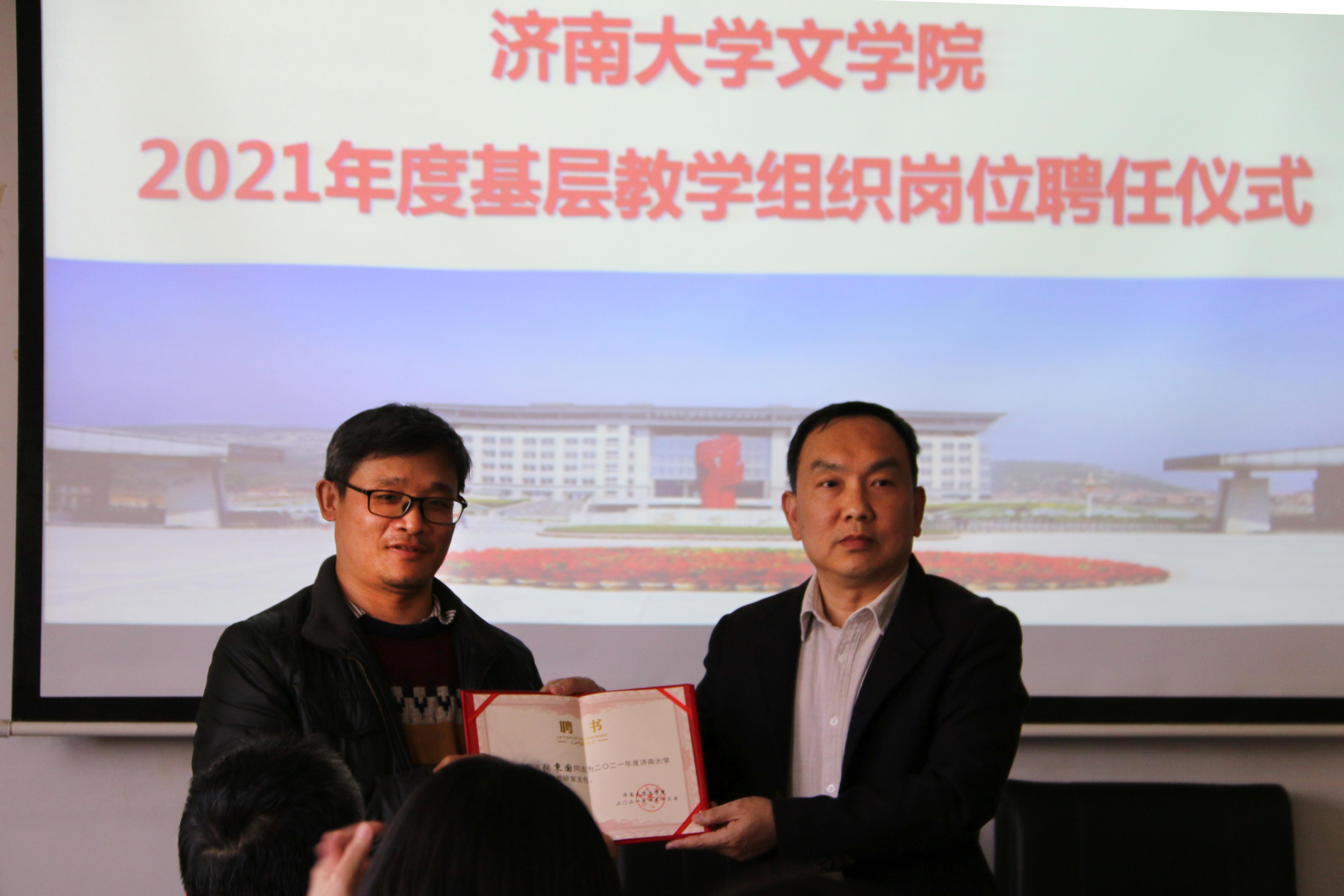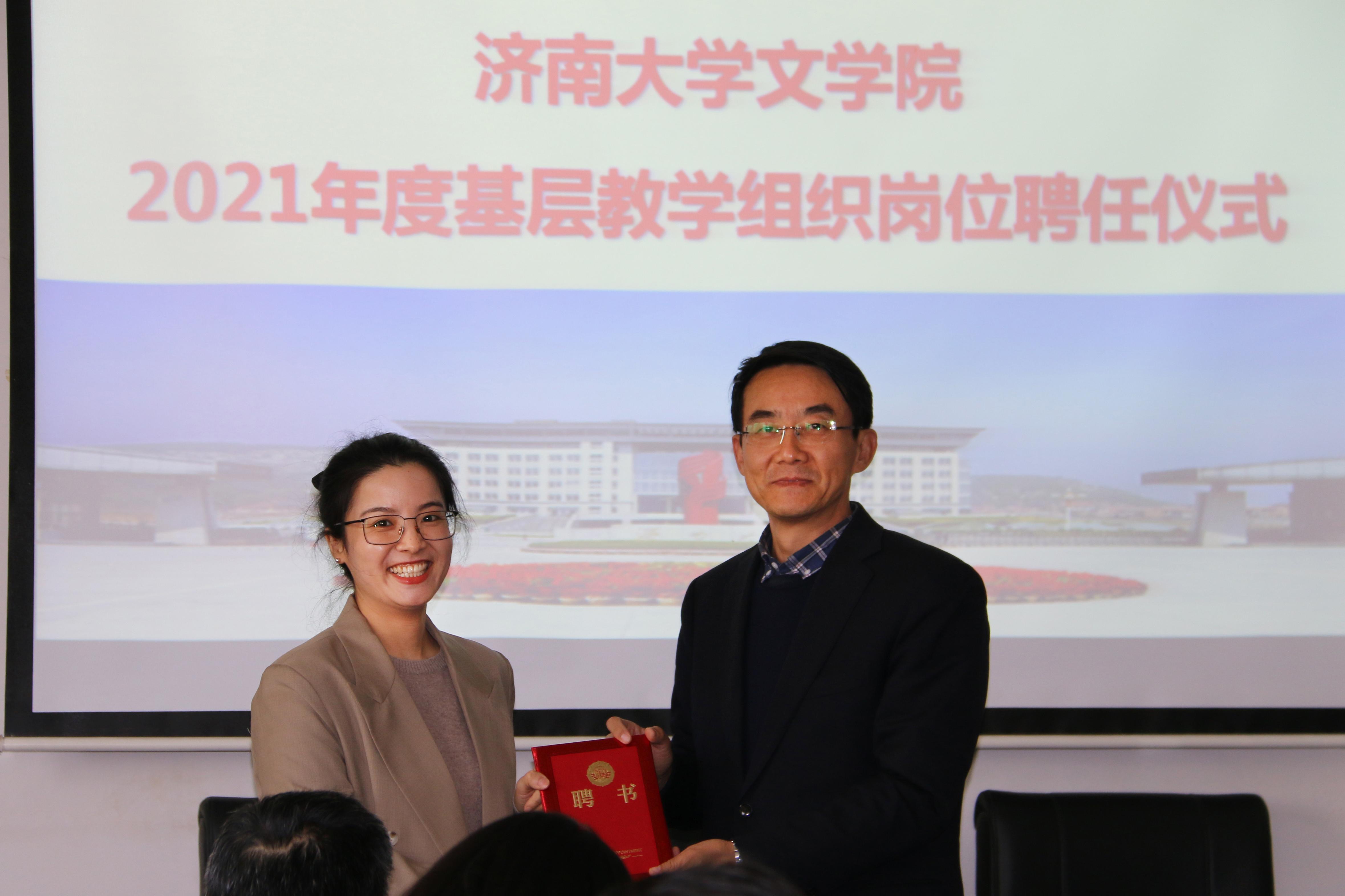 随后,学院基层教学组织负责人聘任仪式在ok138cn太阳集团529会议室正式举行。首先,张兵院长向全体教师宣读了《ok138cn太阳集团529基层教学组织负责人聘任决定》,决定聘任王蓓等10人担任学院教研室主任、聘任蒋莹担任汉语言文学专业实践教学负责人,同时决定推荐张小平等4人分别担任汉语国际教育、广播电视学、广告学、编辑出版学专业负责人。随后,陈卫东书记、张兵院长分别向新聘任的教师颁发了聘书,并合影留念。至此,聘任仪式圆满结束。
