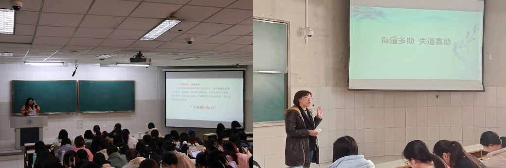 于晶老师为我们带来了一节文言文《得道多助失道寡助》的教学示范课。首先她指出,在导入环节应该用“聊天式”的教学方法让孩子们产生亲近感,从而抓住学生注意力。她在传授讲文言文公开课经验的过程中循序渐进,通过对每个教学环节的详细讲述让同学们对文言文教学有了具体了解。其次,于老师提出,在课堂结尾一定要对孩子们进行价值观教育,引领他们走正确的人生道路。在最后的提问环节中,同学们积极提问,于老师也耐心的给予解答。本次公开课使同学们深受启发。