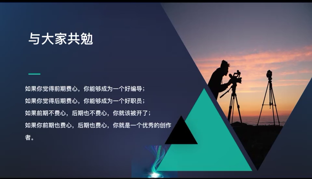 讲座伊始,张老师从最基本的叙事功能、抒情功能、思想功能三方面讲述了纪录片拍摄三个不同的创作级别,并以自身参与拍摄的电视纪录片《悠然见南山》视频为例,向大家分享该片从选题到拍摄过程中的技巧和经验,他强调,拍摄纪录片的重点是人物与人物关系,在拍摄过程中要懂得抓拍,善于运用前景,并从此片出发,和大家一同分析了编导和摄像的关系。对于艺术创作,张老师指出,纪录片、纪实影像是选择的艺术,纪录片拍摄经过选题、拍摄时机、拍摄角度和剪接素材的四次选择,选择与判断是纪实影像拍摄的关键,也是纪录片的难度和魅力所在,拍摄应从基础做起,多练习对于陌生场景的把控能力,不仅要看镜头运动是否流畅,更要看它为什么运动。在行政报道和主题新闻报道方面,张老师以一个问题入手,分析了前期选题和后期剪辑的侧重点,并形象地解释了主题新闻报道的核心是起承转合,应在创作过程中做好安排。最后,张老师以一句话与同学们共勉,鼓励同学们为成为一名优秀的创作者共同努力。孙佳祺老师对专题讲座做了总结发言,以一位同学的实例勉励大家以更加诚恳的态度迎接新的挑战与机遇!