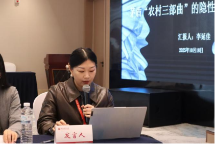会上,李延佳老师作了题为《“时代性”的另面:茅盾“农村三部曲”的隐性艺术内涵》的学术报告。这篇论文突破以往对茅盾“时代性”偏重政治解读的局限,转而聚焦于其“农村三部曲”中被忽视的隐性艺术内涵。通过分析小说中关于乡村仪式、身体叙事和秩序再造的描写,揭示了传统凝聚力变迁、现代性扩张等深层主题。这些内涵在呼应主流政治话语的同时,亦展现出文本的复杂意蕴与多重解读空间,从而极大地丰富了作品多元而持久的艺术魅力。李延佳老师的报告观点鲜明、论证扎实,引发了与会专家的广泛关注与热烈讨论。
