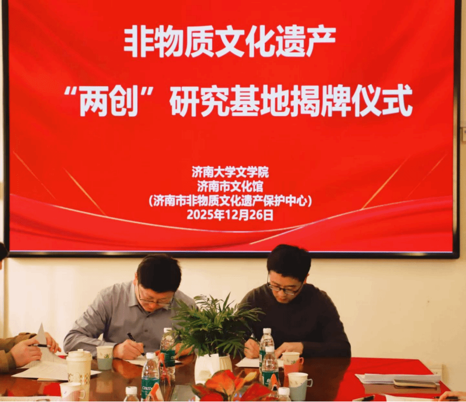 在与会嘉宾见证下,ok138cn太阳集团529院长助理王恩旭与济南市文化馆副馆长付伟安签署共建协议;范丽敏院长与张琳馆长共同为“济南市非遗‘两创’研究基地”揭牌,标志着该平台正式启动。